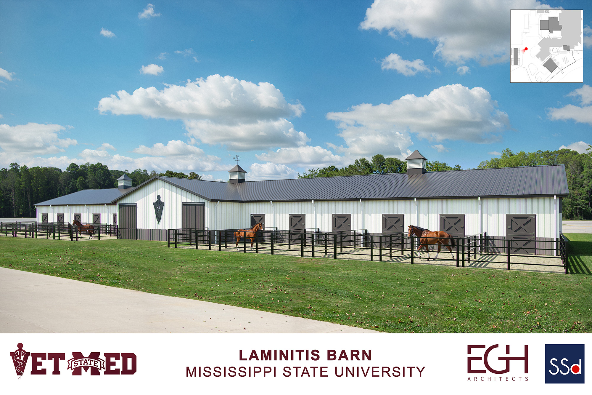 Located at the Mississippi State University College of Veterinary Medicine, the project will be a 12,500-square-foot, state-of-the-art facility featuring a large multi-investigator laboratory and clinical research space. An adjacent 8,100-square-foot equine research barn will feature 24 stalls to house horses, enabling comprehensive in-lab and in-barn research to accelerate discovery.